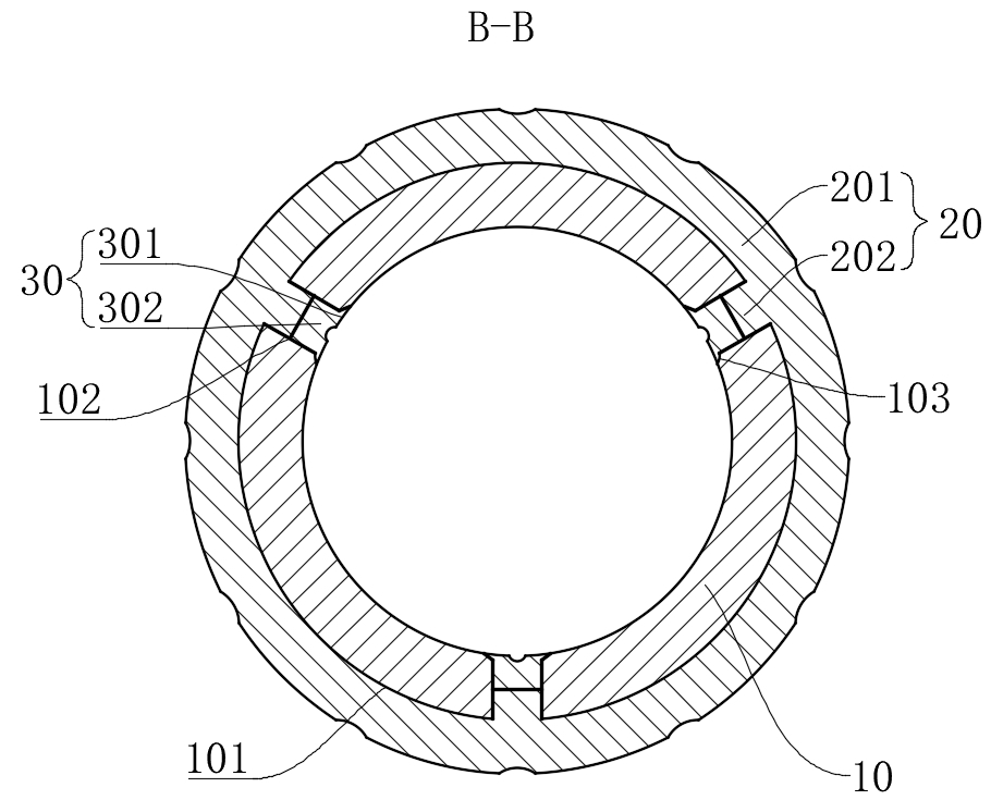 Il secondo blocco auto-lubrificante (30) è incorporato nella scanalatura di installazione (103), con il suo secondo pin limitante (301) che penetra attraverso la parete laterale dell'anello di regolazione per formare un interblocco assiale con il foro limitante (102), costruendo una rete di vincoli tridimensionali (vedere la figura sotto).